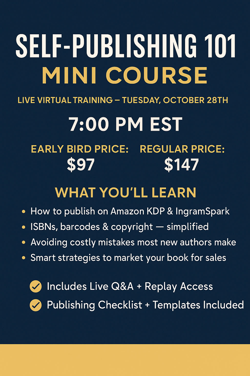 👉 Secure your Early Bird spot today for only $97 and walk away with everything you need to publish your own book with confidence.